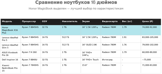 Сравнение характеристик ноутбуков в сегменте 16-дюймовых мультимедийных устройств с AMD Ryzen 7