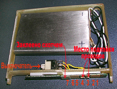 «Служебными» я назвал контакты, с которых на компьютер поступает информация о состоянии батареи, не реальная в моём случае, а так, как её представляет контроллер. Выяснилось, что если контакт 7 отключить (я заклеил его скотчем), а контакты 3 и 4 замкнуть, батарея будет работать до достижения минимального допустимого напряжения(3,4-3,45в), далее ёе отключит контроллер. Всё это время компьютер будет показывать 100% заряд. Для зарядки контакты 3-4 необходимо разомкнуть. Чтобы всё это осуществить я впаял между контактами 3 и 4 фиксируемый выключатель. Провода, идущие к нему припаяны на край самих контактных пластин, а выключатель размещён внутри батарейного отсека. Банка подключена к контроллеру тонким многожильным проводом, рамка сделана из стеклотекстолита и склеена клеем «Космофен»(«Момент-супер»), контроллер приклеен к ней на толстый скотч на резиновой основе. Из фото, я думаю, всё понятно.